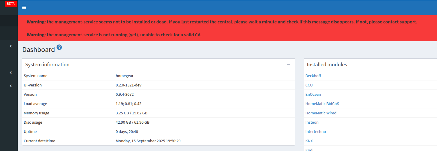 im Admin UI gibt es eine Meldung (in rot), die lautet: “Warnung: der Management-Service scheint nicht installiert zu sein, oder zu laufen. Wenn Sie die Zentrale gerade erst neu gestartet haben, warten Sie bitte einen Moment und schauen ob diese Meldung verschwindet. Sollte dies nicht der Fall sein, kontaktieren Sie bitte den Support.”